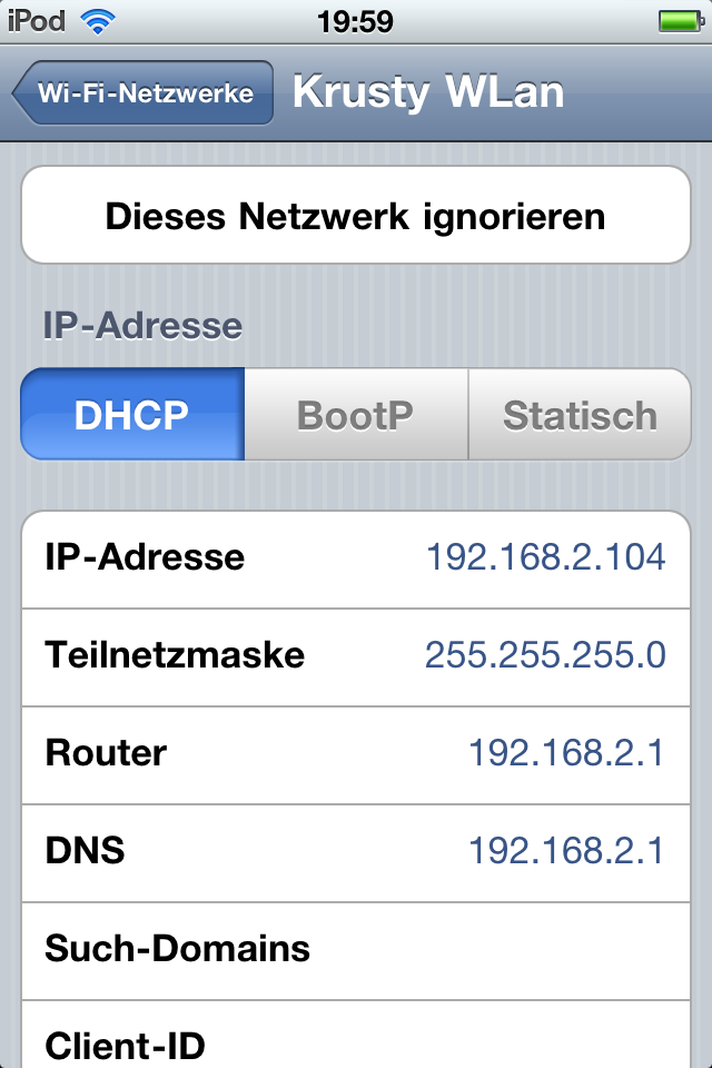 So nun wechselst du mal zu deinem iPod, aktivierst WLAN, und klickst auf den blaue Pfeil. Dort sollte deine IP-Addresse stehen. Beim Setup schaust du mal wie das Gerät mit dieser IP heisst und schreibst es auf oder merkst es dir (Wichtig)! Nachdem das geschehen ist, wechselst du auf Port-Forwarding und tippst bei TCP Port den TCP Port des Push-Dienstes ein (diese 5223 oder so). Dann irgendwo sollte dann stehen Gültig für und da suchst du das Gerät aus das wir gefunden haben. Dann klickst du auf speichern und schaust mal ob es geht.